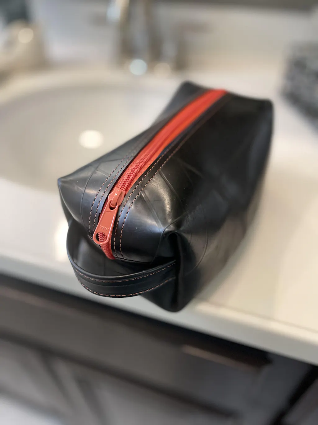 This upcycled travel companion is suitable for carrying all of your essential grooming and bath accessories. With an exterior constructed from durable reclaimed truck and bicycle inner tubes, this versatile bag is highly water-resistant. A full handle loop on one end and a smaller hanging loop on the other. Fully lined interior. Markings and patterns vary widely, no two are alike.