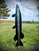 This muskellunge snow gauge is cut from 14ga steel, and reinforced with a galvanized rod. The rod also serves as a ground stake so that the fish stands straight up. Measures up to 42-inches of snow and the musky stands 18-inches tall. Perfect for your yard this winter.