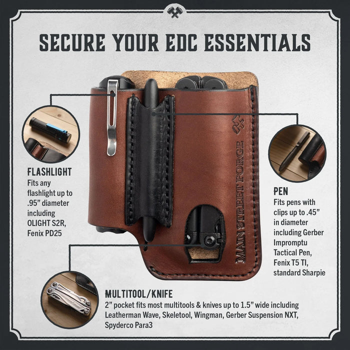 Leather EDC Pouch - Belt clip Multitool, Flashlight & Pen Sheath