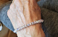 Elevate your style with our stunning Two Metal Embossed Wire Wrapped Crystal Bangle. This hand-crafted piece features intricate wire wrapping and sparkling crystals, adding a touch of elegance to any outfit. Elevate your look and make a statement with this unique and beautiful bangle. Embossed closed bangle is handmade from two metals. It is made from sterling silver and copper, which I united with each other, formed and sculpted into the shape of a bangle. The sterling silver part is embossed with a special hammer, the copper part is smooth and holds a row of 20 super sparkly eye-catching Swarovski Crystals which are wire wrapped on with sterling silver wire. The bangle has a larger inner diameter of a little over 2.75 inches so women will be able to wear it as a arm bangle also. This original designed bangle can also be stacked with any of my copper or sterling silver bangles.
