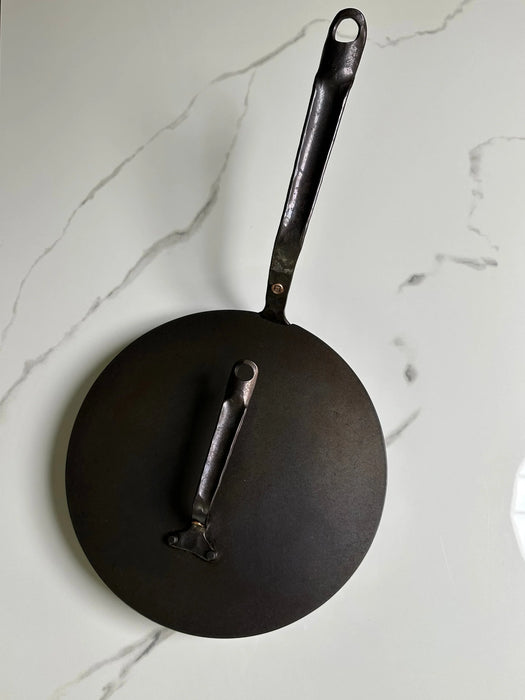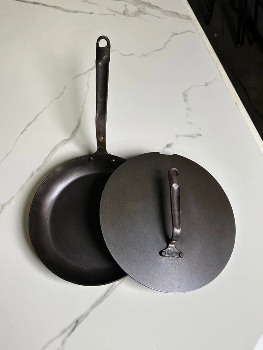 Add a Flat French style carbon steel lid to your order! Our carbon steel lids are cut to match the shape of your skillet with a small overhang to account for hand forged variability. We forge a smaller version of our skillet handle that matches the style of the skillet, and attach it with two steel rivets. It is perfect for creating a convection within your skillet. ***Lids are made to order and can add up to 5 days to regular processing time.