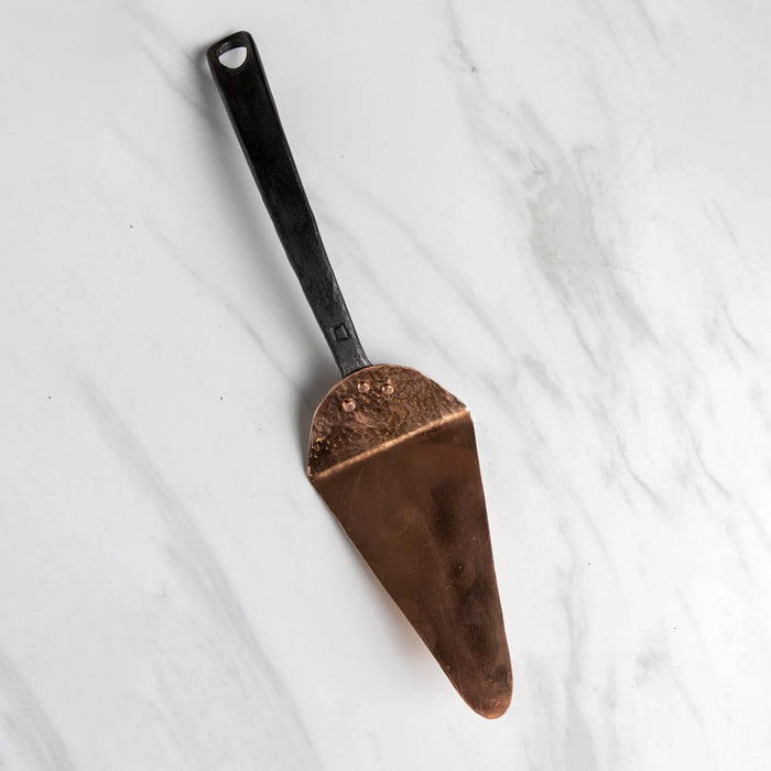 Our elegant forged copper and carbon steel pie server has a beautifully curved handle riveted to a hand-peened copper serving head. We season the handle and buff the copper to a high shine. Copper is a soft metal, so expect light scratches to appear through use. We think these character marks enhance the beauty of your piece. For information on how to care for copper, please visit our care page.